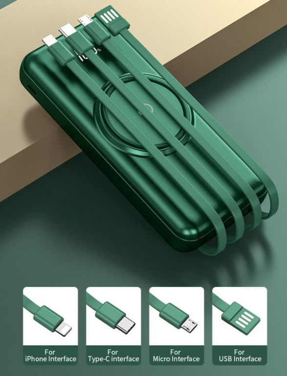 Внешний аккумулятор с беспроводной зарядкой Wireless Fast Charging - это уникальное зарядное устройство для зарядка гаджетов, способное одновременно заряжать несколько различных устройств. Он сочетает в себе как беспроводную зарядку, так и с помощью кабелей с различными разъемами. Зарядка через кабели имеет повышенную скорость и увеличенную мощность, аккумулятор автоматически подбирает нужные параметры зарядки для каждого устройства. Пауэрбенк имеет дисплей с отображением уровня заряда аккумулятора, беспроводную зарядку для устройством имеющих функцию беспроводной зарядки, 2 гнезда USB 2,1А, гнездо Type-C и гнездо micro USB. Также Power bank снабжен встроенными кабелями, чтобы Вам не пришлось искать шнуры для зарядки:
